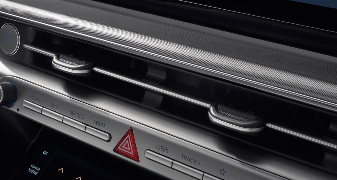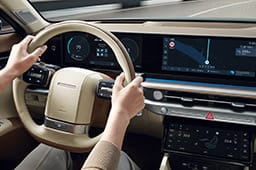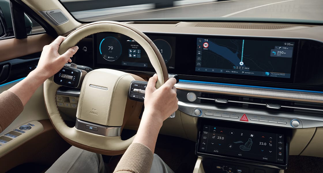 12.3인치 내비게이션(블루링크, 폰 프로젝션, 블루투스 핸즈프리, 현대 카페이/e hi-pass)12.3인치의 대화면 고해상도 와이드 LCD 내비게이션을 구성하고, 클러스터 및 헤드업 디스플레이와 일원화된 GUI 테마를 적용하여 안정감 있는 시인성과 하이테크한 이미지를 제공합니다.
