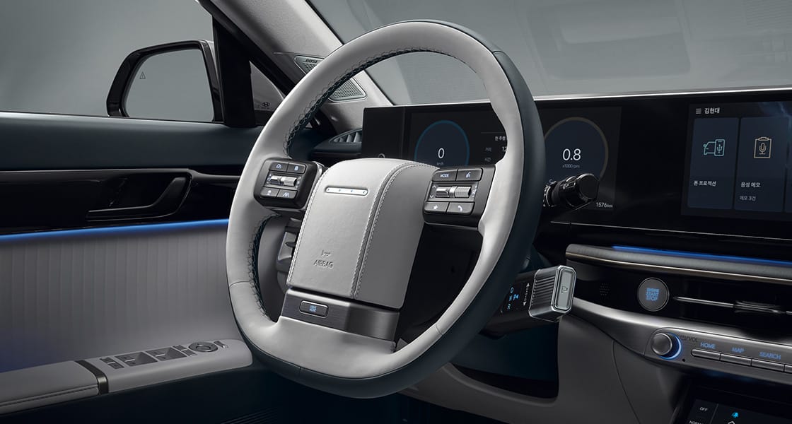 원스포크 타입 가죽 스티어링 휠(열선, 인터랙티브 픽셀 라이트 포함)그랜저의 헤리티지를 계승하면서 하이테크한 감성의 미래지향적인 디자인으로 원스포크 가죽 스티어링 휠을 구현하였습니다. 스티어링 휠 중앙부 혼커버에 4개의 LED 픽셀 조명이 운전자의 차량 조작 및 음성인식과 연계하여 작동합니다.