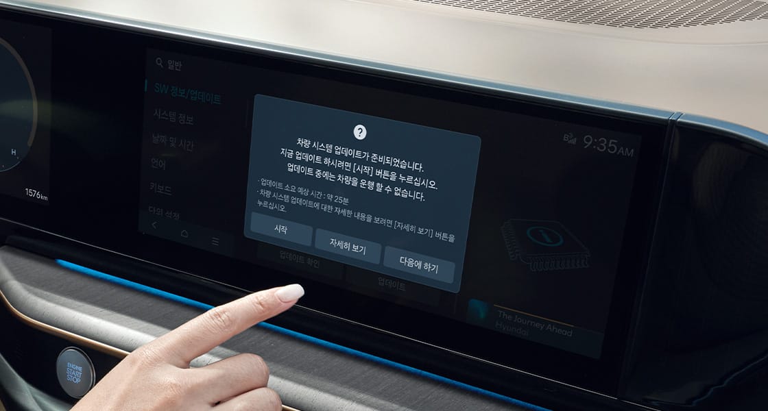 무선 소프트웨어 업데이트(OTA Software Update)업데이트 가능한 최신 버전의 소프트웨어가 있으면 시동 후 주차 및 시동 「OFF」 시 사용자의 승인을 거쳐 무선으로 소프트웨어 업데이트를 진행합니다.<br>* 빌트인 캠 2, 무드 램프, 전자식 서스펜션, 전자식 변속 제어 등 다양한 제어기 업데이트가 가능합니다.