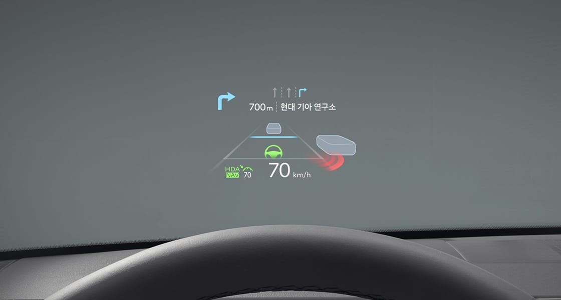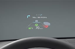 증강현실 내비게이션주행 화면 위에 목적지, 차간 거리, 전방 차량 출발 알림 등 운전에 필요한 각종 정보들을 증강현실 기술을 통해 직관적으로 제공합니다.