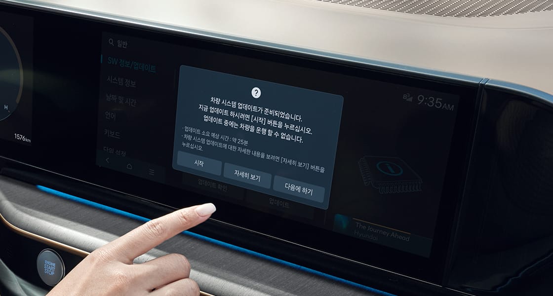 무선 소프트웨어 업데이트(OTA Software Update)업데이트 가능한 최신 버전의 소프트웨어가 있으면 시동 후 주차 및 시동 「OFF」 시 사용자의 승인을 거쳐 무선으로 소프트웨어 업데이트를 진행합니다.<br>* 빌트인 캠 2, 무드 램프, 전자식 서스펜션, 전자식 변속 제어 등 다양한 제어기 업데이트가 가능합니다.