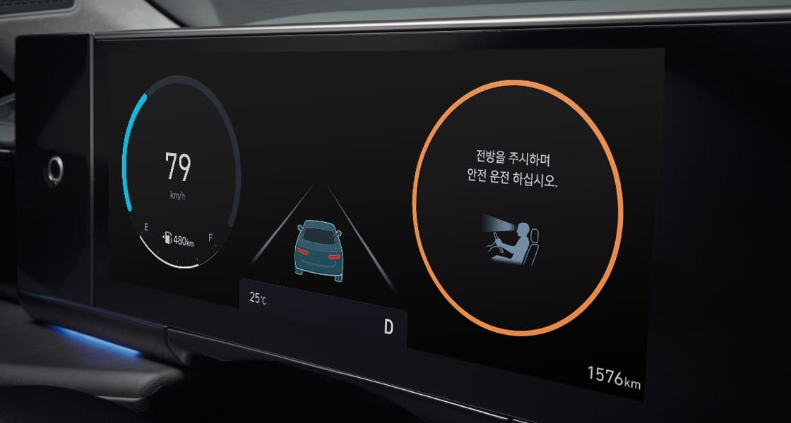 운전자 주의 경고주행 중 운전자의 주의 운전 상태를 분석하고, 운전자의 주의 수준이 “나쁨”으로 떨어지면 경고해주고 정차 중, 전방 차량이 출발하면 운전자에게 알려줍니다.