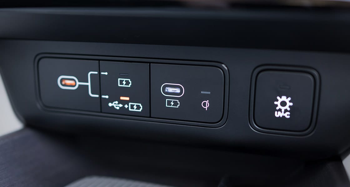 USB C타입 단자(1열 충전 1개/충전·데이터 스위치 타입 1개, 2열 충전 2개)차량용 충전기로서 USB 포트를 통해 각종 스마트폰 및 태블릿 기기 충전이 가능한 충전 전용 단자입니다. 전 좌석에 모드 전환 스위치를 통해 USB 데이터과 충전이 동시에 가능한 모드(블루 조명)와 충전만 가능한 모드(엠버 조명)로 변경이 가능합니다.